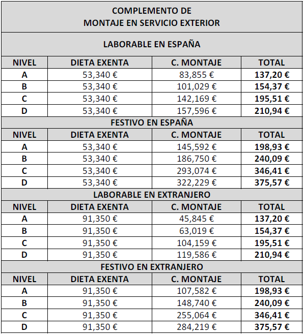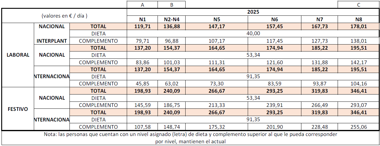 Las cuantías de dieta+complemento se corresponde con cada nivel salarial.